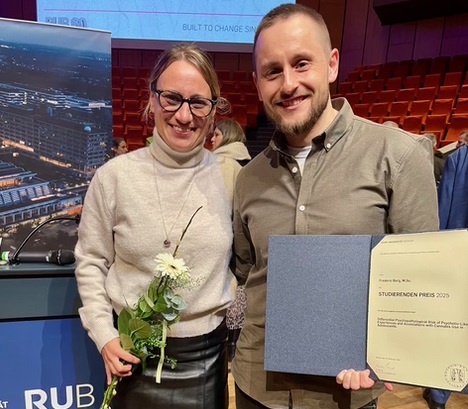 Frederic Berg hat für seine herausragenden Studienleistungen den Studierendenpreis der Ruhr-Universität Bochum (RUB) erhalten. Der Student der Psychologie, der lange Zeit in der Forschungsgruppe YVORI am FBZ mitarbeitet hat, nahm die Auszeichnung bei der Akademischen Jahresfeier der RUB am Mittwoch (19. November) entgegen. Gemeinsam mit seiner Betreuerin Prof. Dr. Mar Rus-Calafell aus dem FBZ feierte er den Erfolg.